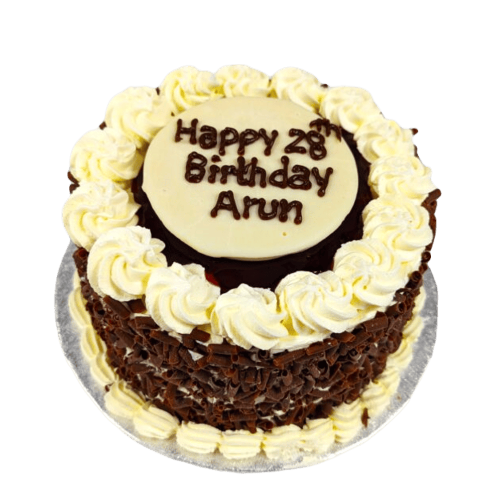A round, fresh-cream chocolate cake filled with a pool of rich cherry jam and decorated with chocolate curls on the side. Your message will be written on a white chocolate plaque placed in the centre of the cake.