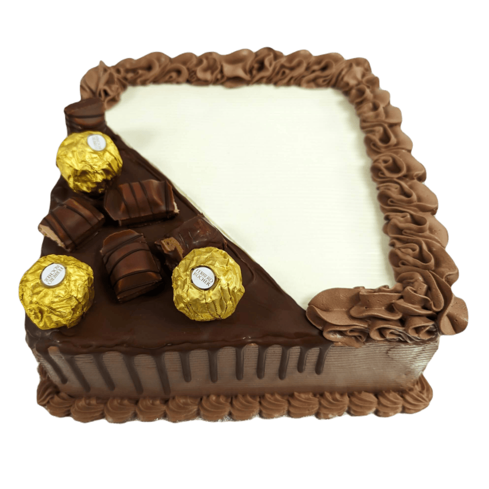 A square chocolate fresh cream cake piped with chocolate cream, with a corner lathered in melted chocolate that drips over the edge. To top it off, we decorate the cake with delicious Ferrero Rocher?s and Kinder Bueno chocolates.