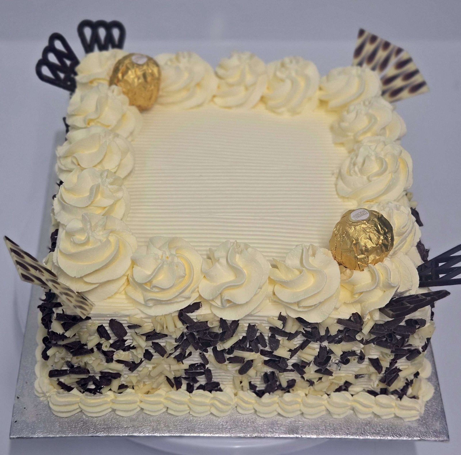 A square fresh cream cake covered with chocolate curls around the side and decorated with Ferrero Rocher chocolates and chocolate leaves.