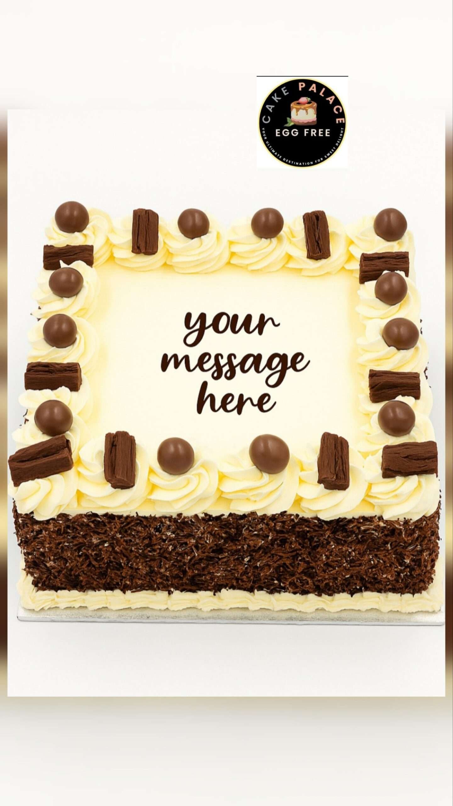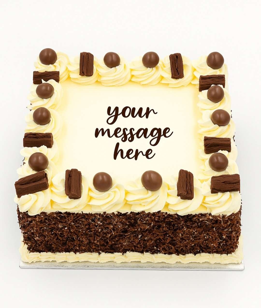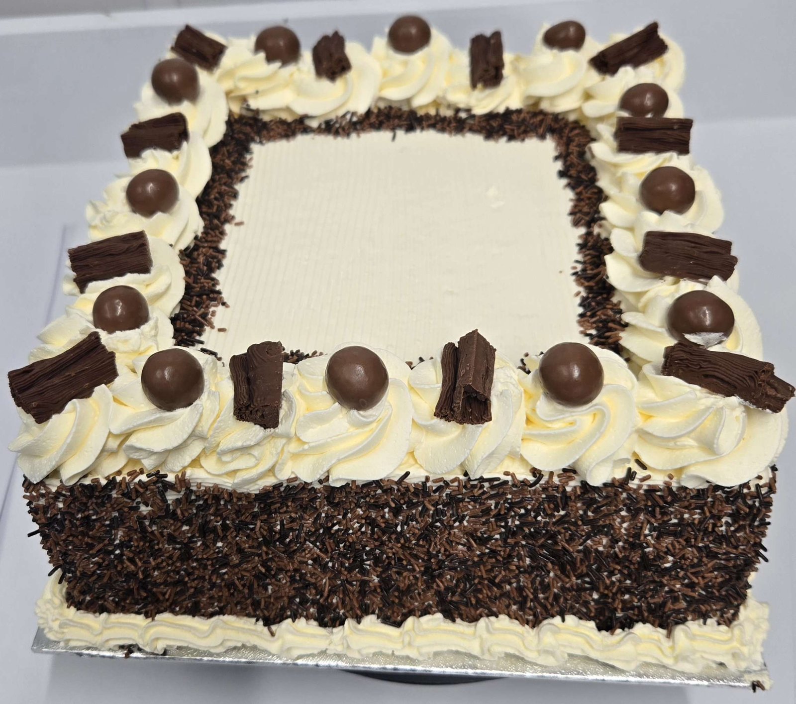 A square fresh cream cake with chocolate curls along the side, topped with Maltesers and flakes.