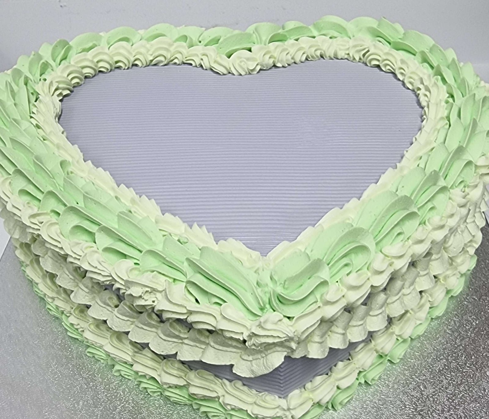 A fresh cream, purple vintage heart cake finished with intricate piping decoration