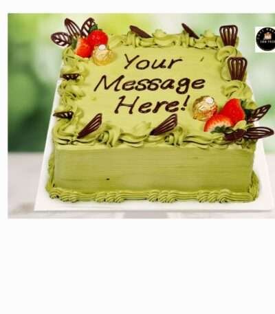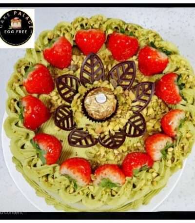 Pistachio cream cake with strawberry and Ferrero plus fans on top